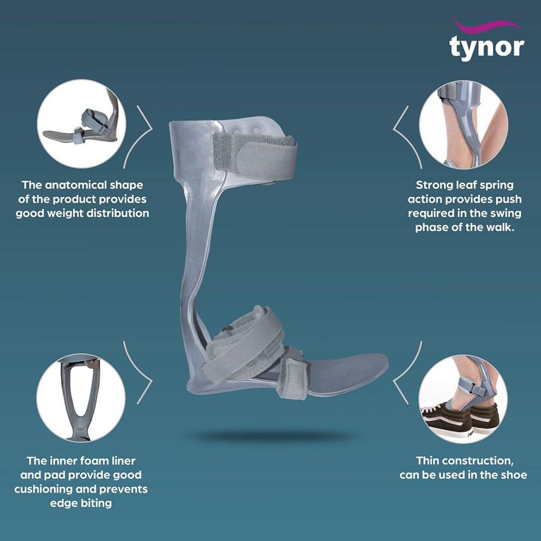 Designed with a dorsal shell made of polypropylene with a leaf spring action to arrest the plantar flexion movement and lift the foot. It supports and stabilizes the ankle and foot in all foot drop conditions. Designed to aid in swing phase toe clearance and to reduce plantar flexion impact in the early stance.