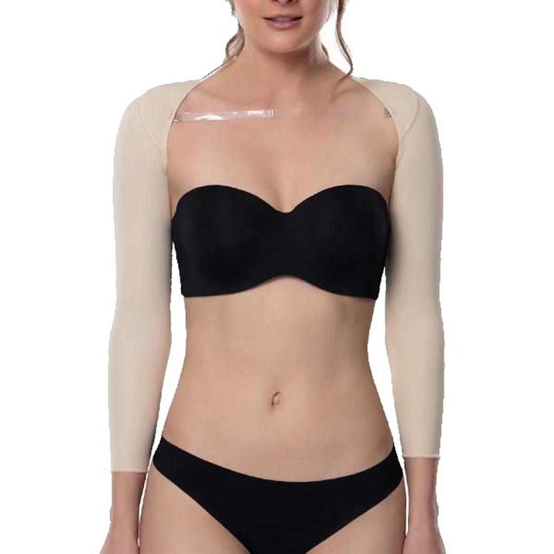 This is a armlet used after liposuction operations and extending up to the wrist. It accelerates blood circulation by applying compression to the operated region. It has 3-stage adjustable clasp from the rear and is combined with front transparent band.