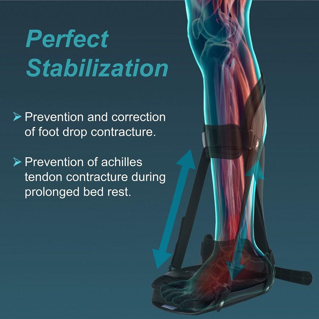 Designed for rehabilitation after injury, fracture, sprains or surgery of foot, ankle or lower leg to prevent plantar flexion, when required. It supports lifting the ankle, constraining the plantar flexion, and enabling prevention of conditions like foot drop or contractures on prolonged bed rest.